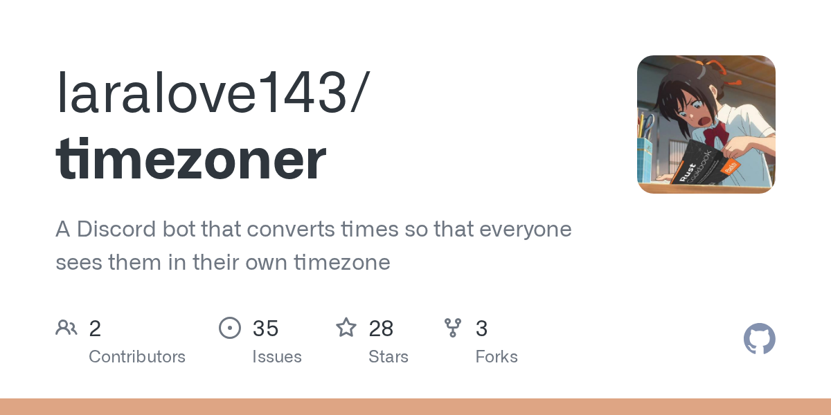 a discord bot that converts times so that everyone sees it in their own timezone - GitHub - laralove143/timezoner: a discord bot that converts times so that everyone sees it in their own timezone