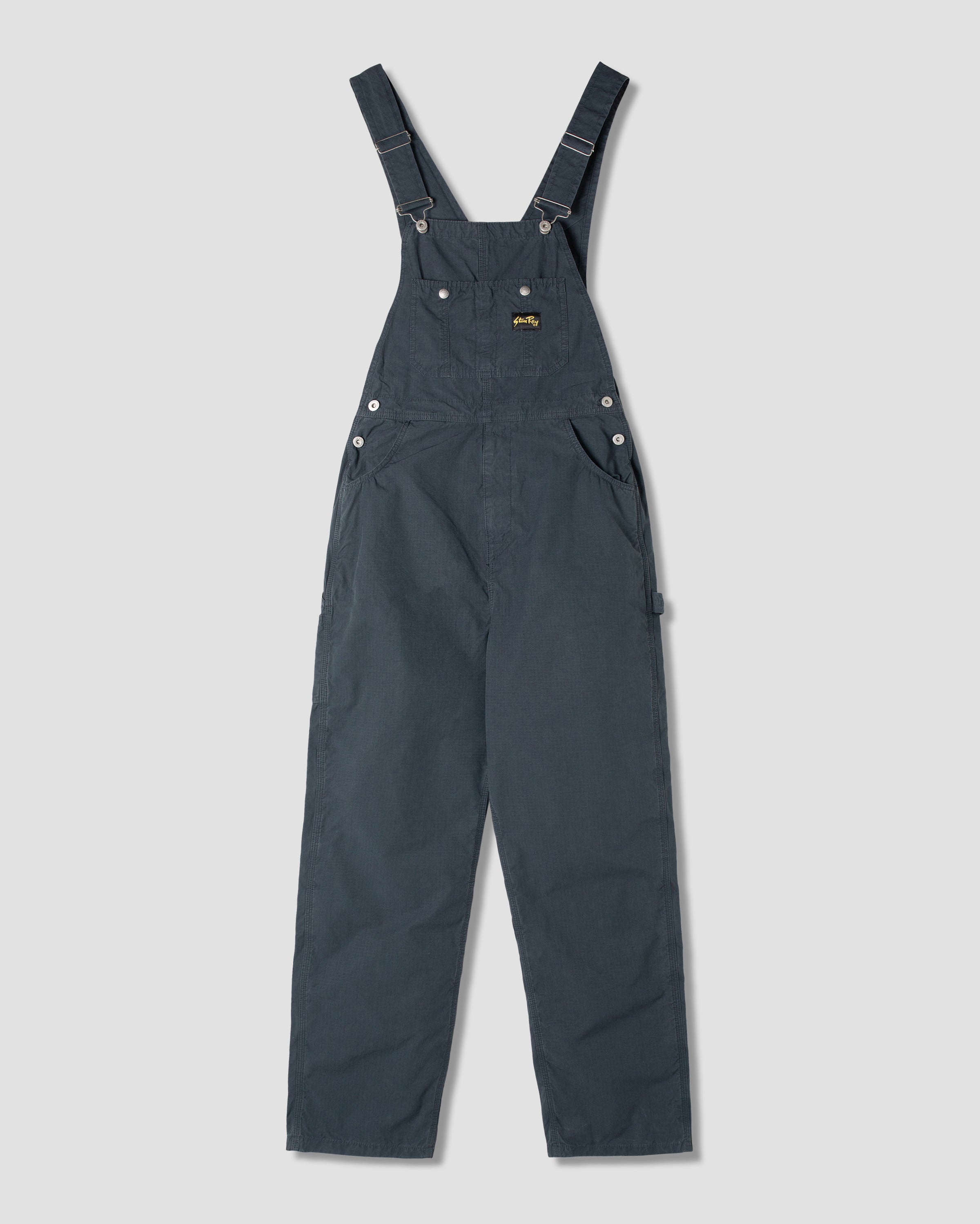 Based on the original vintage Stan Ray Bib made by Earl. Regular fit with a slightly tapered leg. Available here in Navy Ripstop. Adjustable shoulder straps with buckle clips Double shank button side closure Painters loop Side brush pockets Flat-felled, triple chain-stitched critical seams Zip-fly Bar-tacked pockets M