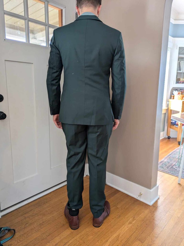 Took some photos of the suit in question with two different undershirt examples (white cotton and green linen). Neither of these shirts would actually be used for the wedding, but I could get something similar.