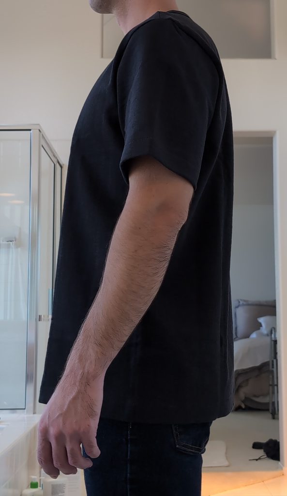 In the following images I'm wearing a Merz b. Schwanen 2S14 in size XL. I'm 75kg and 180cm. I read these run small and to size up, they also shrink after the first wash. Length should be reduced by at least an inch and same for the shoulders. Should I exchange for a size L or stay with this and give it a wash?