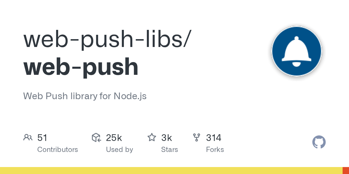 Web Push library for Node.js. Contribute to web-push-libs/web-push development by creating an account on GitHub.
