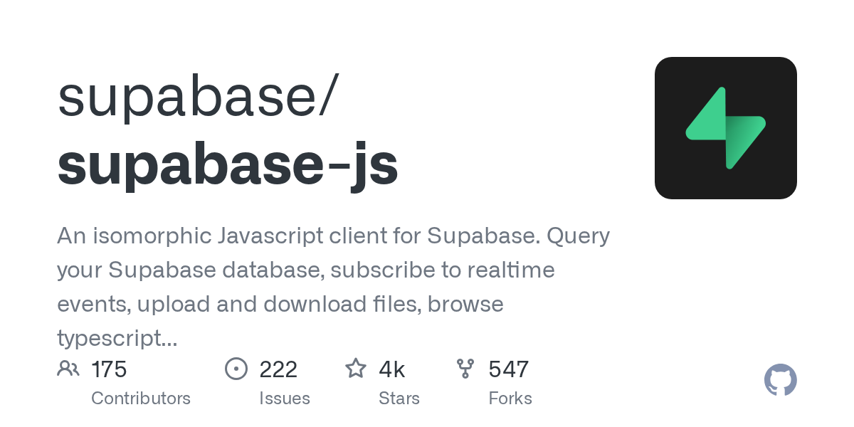 An isomorphic Javascript client for Supabase. Contribute to supabase/supabase-js development by creating an account on GitHub.