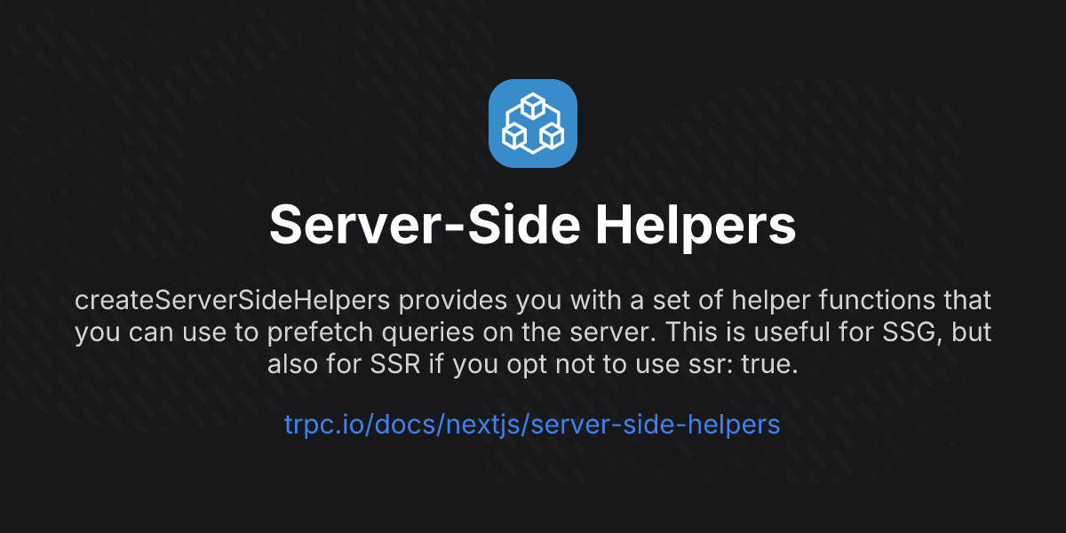 createServerSideHelpers provides you with a set of helper functions that you can use to prefetch queries on the server. This is useful for SSG, but also for SSR if you opt not to use ssr: true.