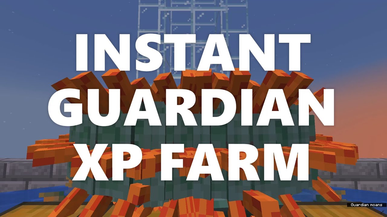 Superfast guardian XP farm that doesn't require draining the ocean monument and can be built in under 30 min if you know what you're doing. Produces XP a little faster than you can absorb it, at 180,000 XP per hour, and can generate about 90k drops per hour (dph) with Looting 3 (50k shards+20k crystals+20k cod).