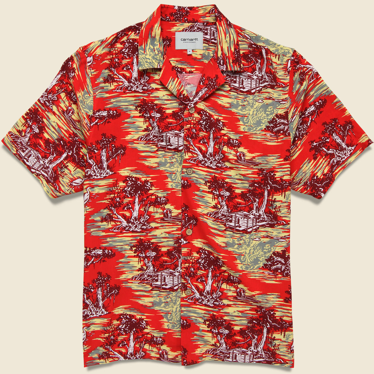 - Carhartt WIP. I like the pattern, and I've seen it modeled in some pretty cool fits online. I'm honestly not sure I've got sufficient executive function to properly care for viscose though. https://stagprovisions.com/collections/tops-short-sleeve-shirts/products/bayou-shirt-red-sunset