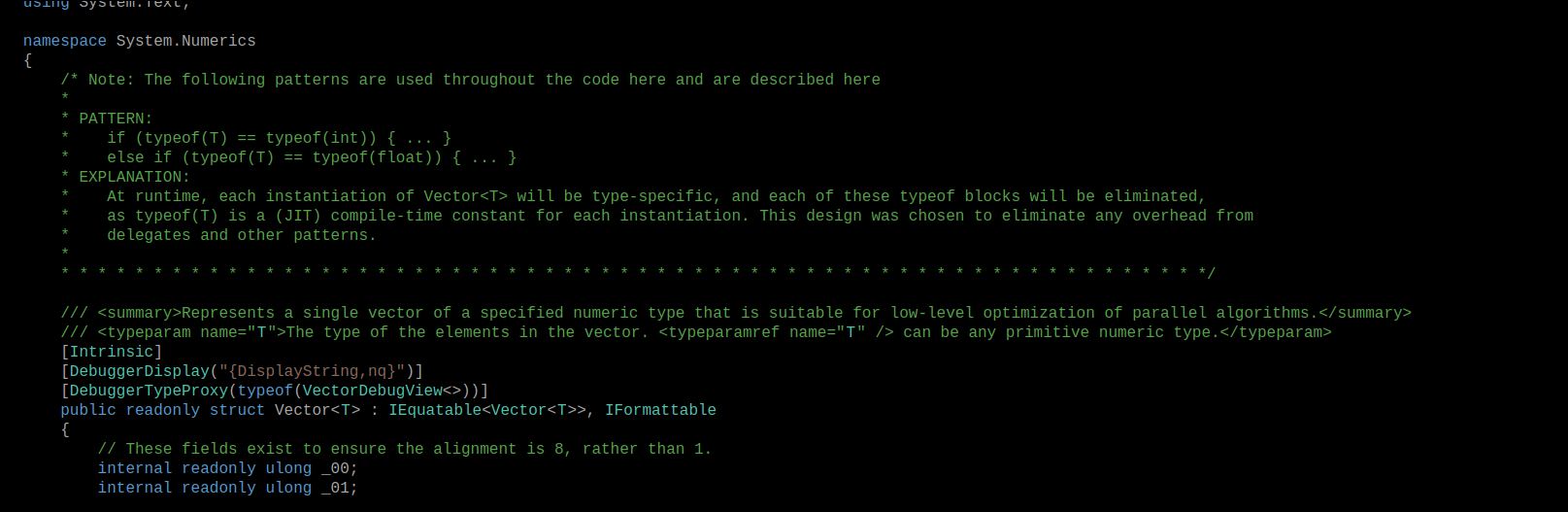 // Scalar based implementationif (typeof(T) == typeof(float)) return System.Numerics.<T>.F(Scalar.As(param1), ...);