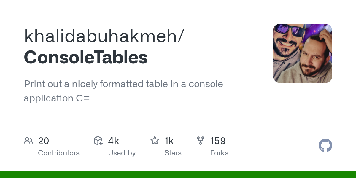 Print out a nicely formatted table in a console application C# - GitHub - khalidabuhakmeh/ConsoleTables: Print out a nicely formatted table in a console application C#