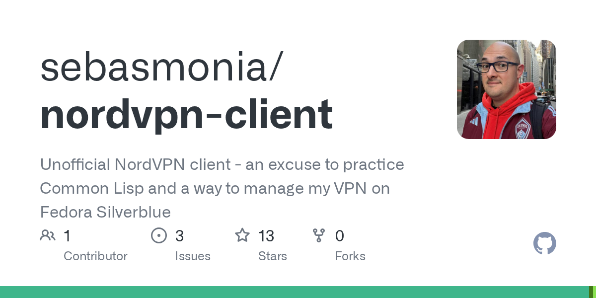 Unofficial NordVPN client - an excuse to practice Common Lisp and a way to manage my VPN on Fedora Silverblue - GitHub - sebasmonia/nordvpn-client: Unofficial NordVPN client - an excuse to practice...