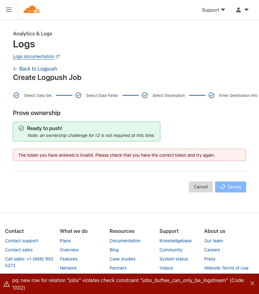 Can't create Logpush Job: fail to prove ownership