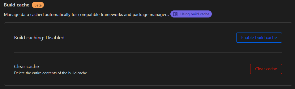 wrangler.yarn/cache needs to be cached for the "Fetch step" and .yarn/install-state.gz needs to be cached for the "Link step"..jampack/cache used by jampack. A user has been asking for it https://github.com/divriots/jampack/issues/106jampack is too small for you to consider it, could you add a generic folder like ".build_cache" or something so projects don't need to highjack existing folders to work around it?.next/cache doesn't work. We don't want to update the root directory option (since we have functions and web/Next.js as top-level directories in our repo)11:28:27.392 ➤ YN0000: ┌ Fetch step