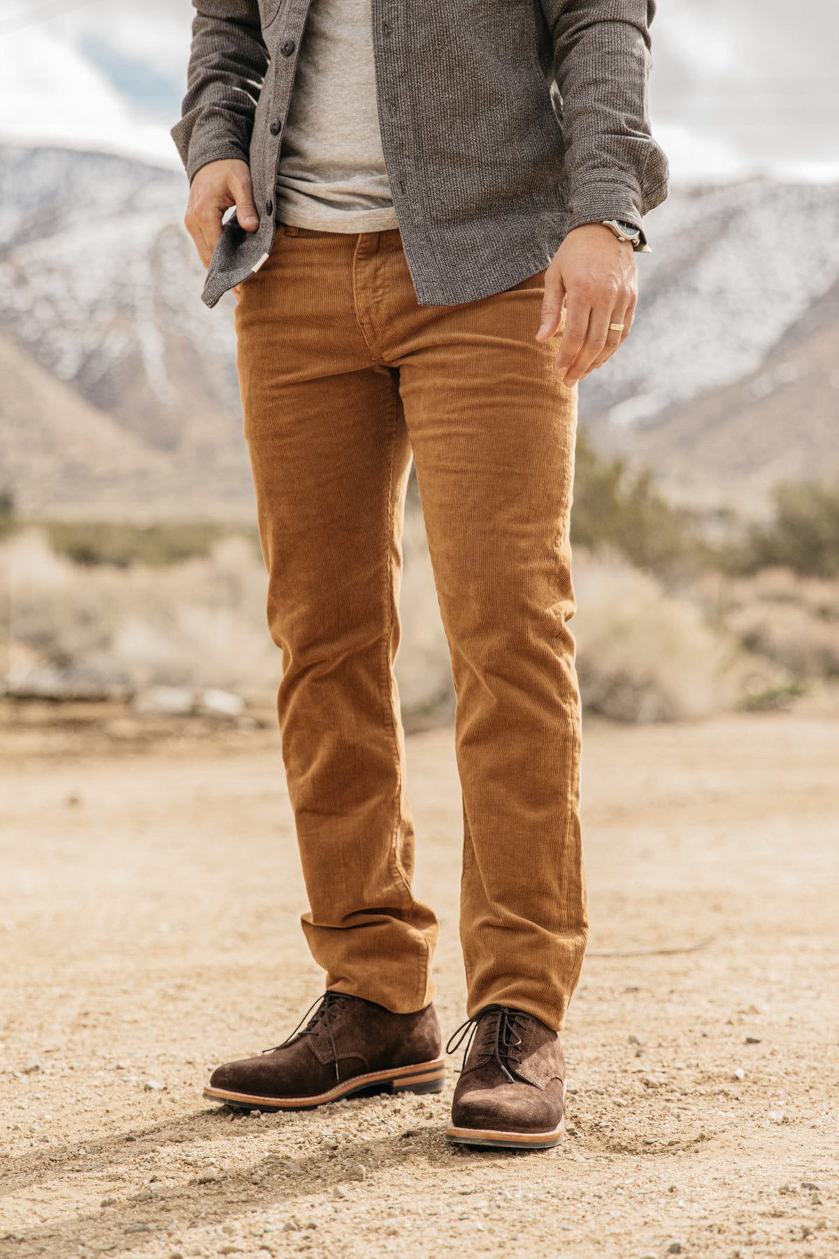 Men’s corduroy pants that are cut like a jean, feels like a chino, and stretches like a performance pant