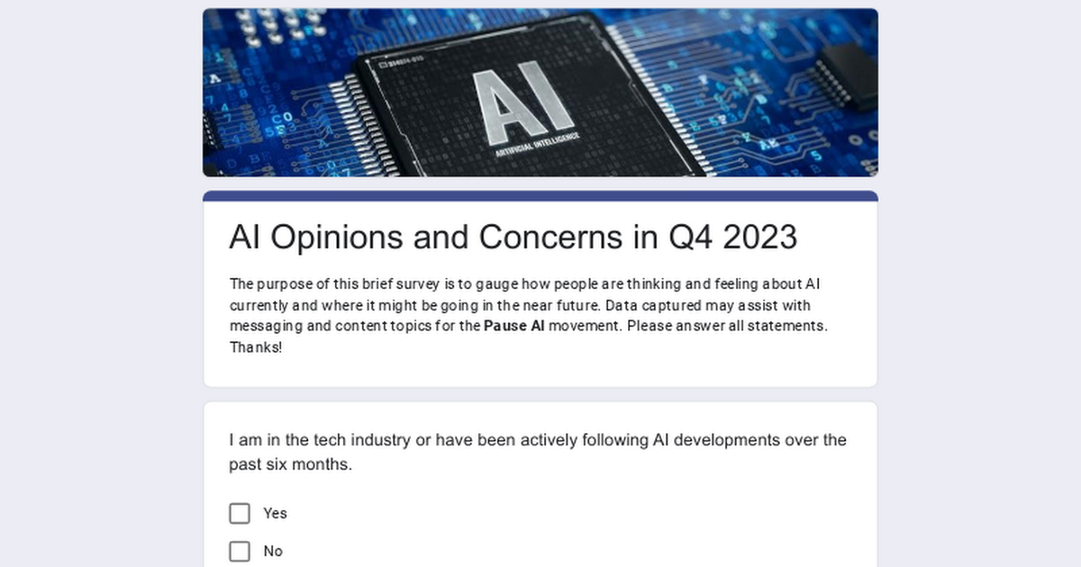 The purpose of this brief survey is to gauge how people are thinking and feeling about AI currently and where it might be going in the near future. Data captured may assist with messaging and content topics for the Pause AI movement. Please answer all statements. Thanks!