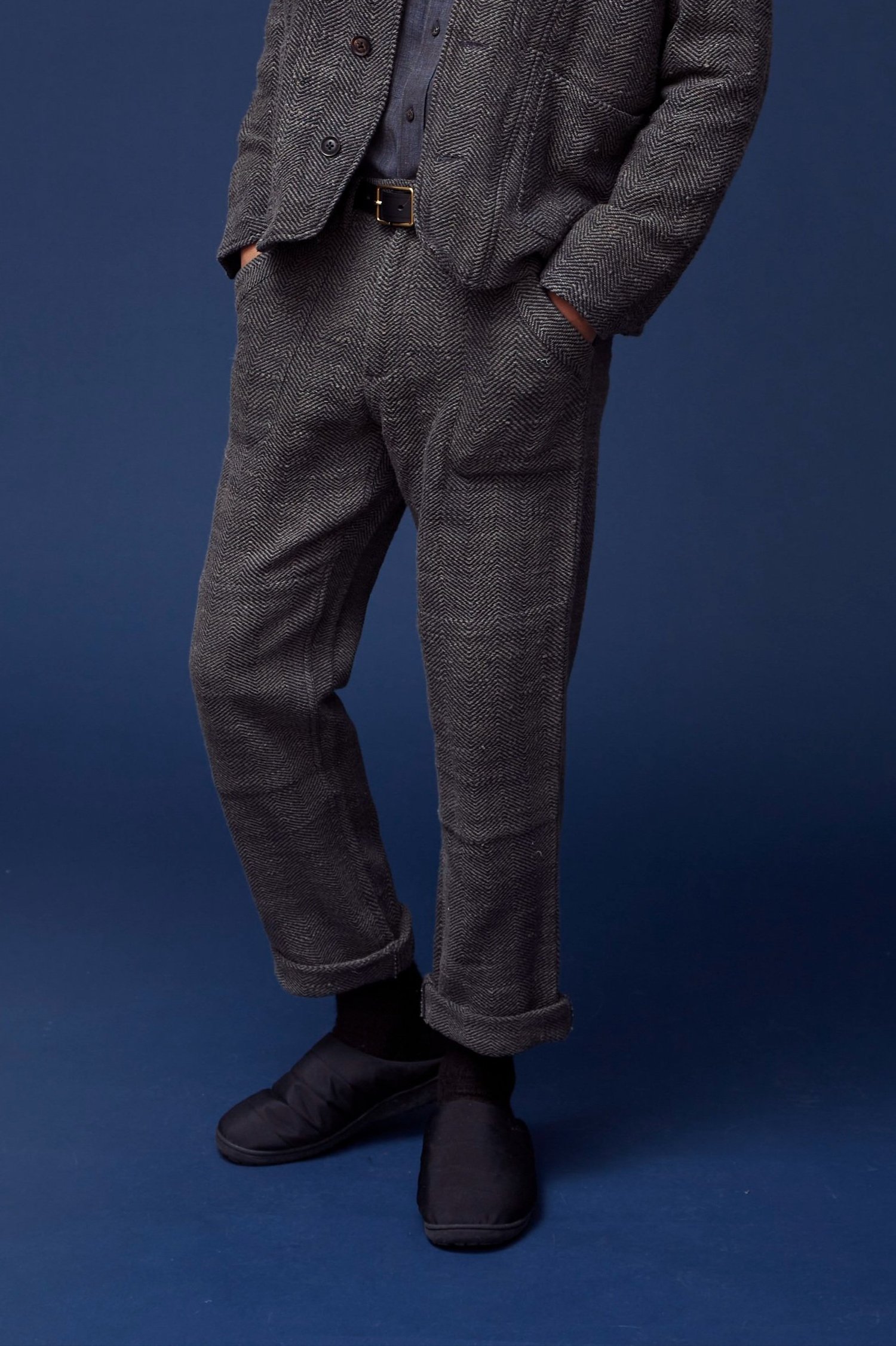 Our Isaac Pant, classic fitting straight leg, with reinforcements at the knee, and patch pockets. The 2nd part of our casual, unconstructed suit inspired by french vintage workwear. The fabric is truly special. handwoven from Handspun yarns in a broad herringbone, this one is all texture. Diluted