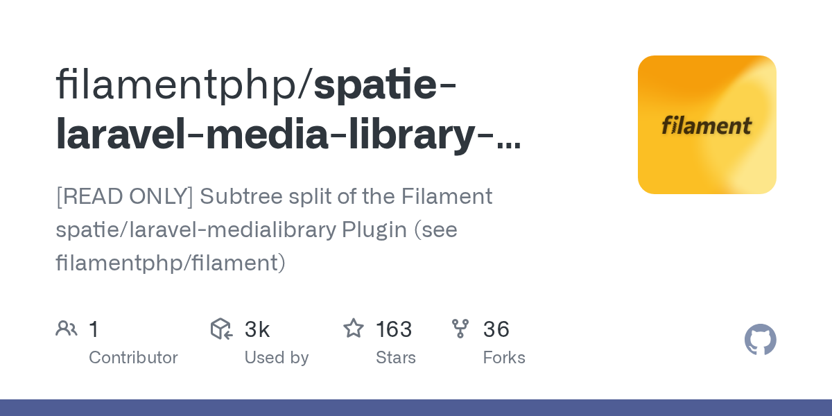[READ ONLY] Subtree split of the Filament spatie/laravel-medialibrary Plugin (see filamentphp/filament) - GitHub - filamentphp/spatie-laravel-media-library-plugin: [READ ONLY] Subtree split of the ...
