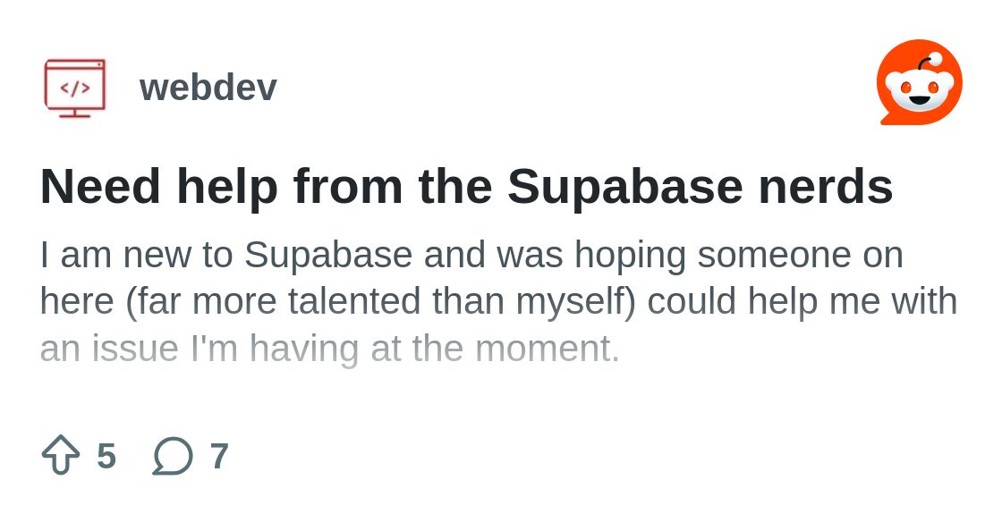 https://www.reddit.com/r/webdev/comments/197v6ht/need_help_from_the_supabase_nerds/