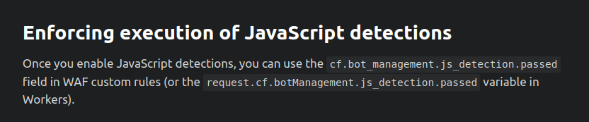 docker run -p 8888:8080 since the default port is 8080...i don't know if this causes issues with Cloudflared-p 8080:8080 would be listening on all IPs anyway) and point cloudflared to that--network host and then localhost will magically work. (This isn't recommended)not entitled: the use of field cf.bot_management.js_detection.passed is not allowed, a Bot Management plan is required when trying to use the cf.bot_management.js_detection.passed field in WAF rules even though the documentation says I can.