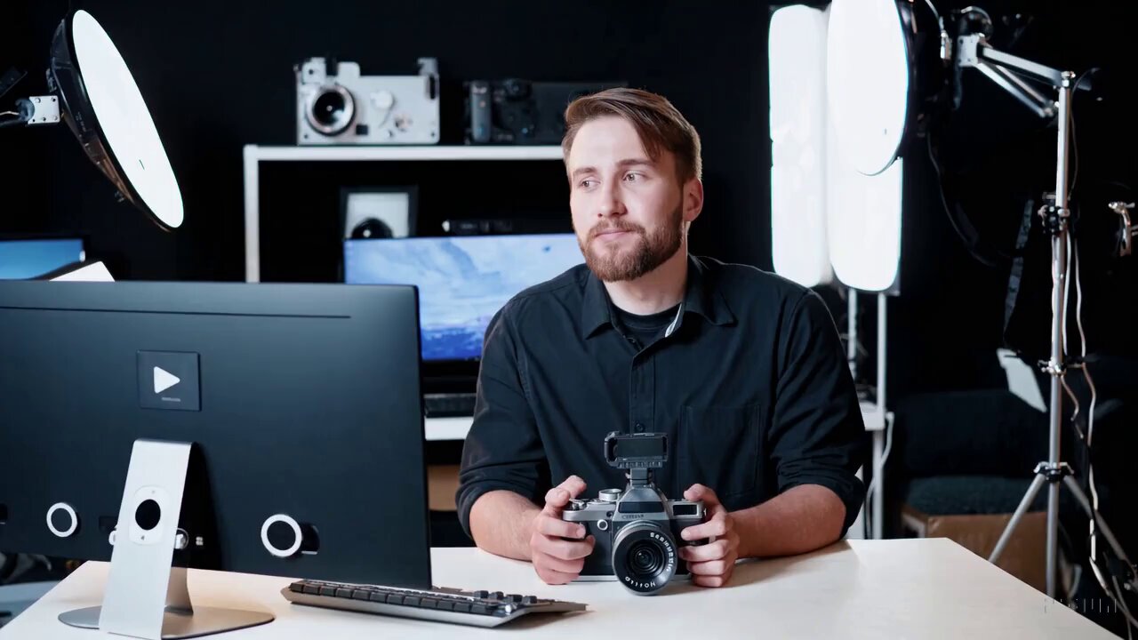 Prompt 3: A young professional product reviewer in a well lit video studio is surrounded by gadgets and technology, sitting in front of a computer with two displays. He's holding a cinema camera as he ponders what video to make next. He is in focus, while the background is…