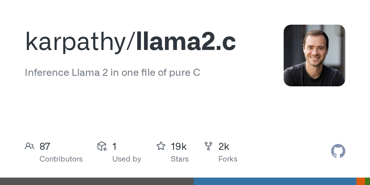 Inference Llama 2 in one file of pure C. Contribute to karpathy/llama2.c development by creating an account on GitHub.