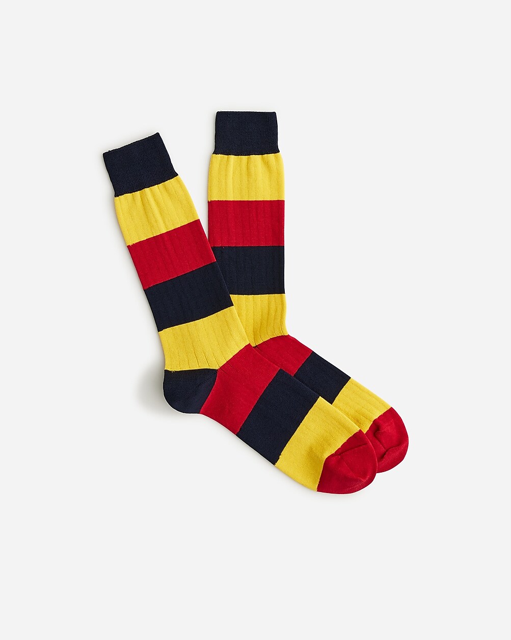 These are in the ballpark of what I'm looking for, and I might just pick them up: https://www.jcrew.com/p/mens/categories/accessories/socks/dress-sock/ribbed-dress-sock-in-stripe/BS578?color_name=navy-multi-rugby-stripe&colorProductCode=BS578