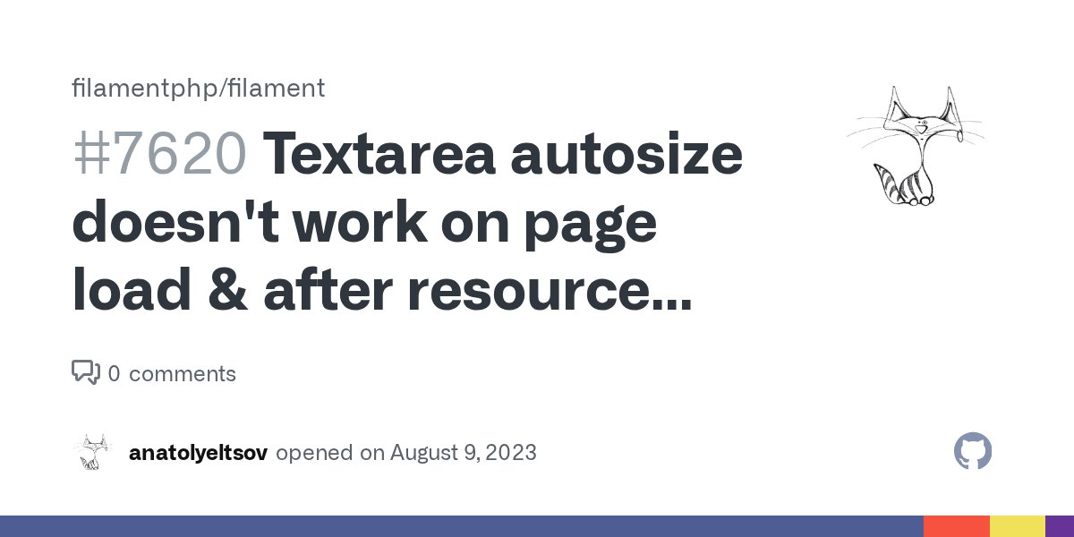 Package filament/filament Package Version v3.0.15 Laravel Version v10.18.0 Livewire Version v3.0-beta PHP Version PHP 8.1.7 Problem description Textarea auto sizing works only when you write some t...