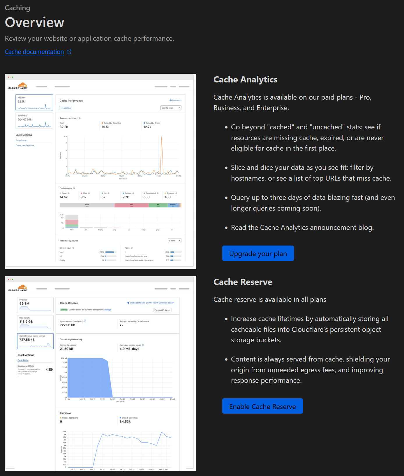I've subscribed to the "Pro" plan, but it seems I don't have access to the "Caching - Overview" page, although it should be available according to the information provided. Please see the screenshots: