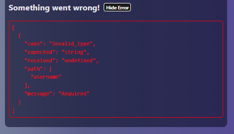 catch to the zod validations but I wanted to display an error component to the user if username validation fails. If I remove the catches on the zod validation I see the onError hit because I see the console log "onError caught - Validation Error" BUT it's not rendering the component that I'm returning from onError.. instead I see some other default error component for some reason. Any ideas?