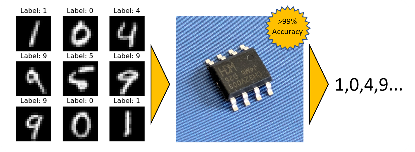 Utilizes quantization aware training and fine-tuning methods, achieving over 99% accuracy on tasks like MNIST.