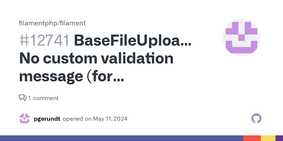 Package filament/forms Package Version v3.2.76 Laravel Version v10.48.10 Livewire Version v3.4.12 PHP Version PHP 8.3.7 Problem description Having an upload with a custom validation message: Upload...
