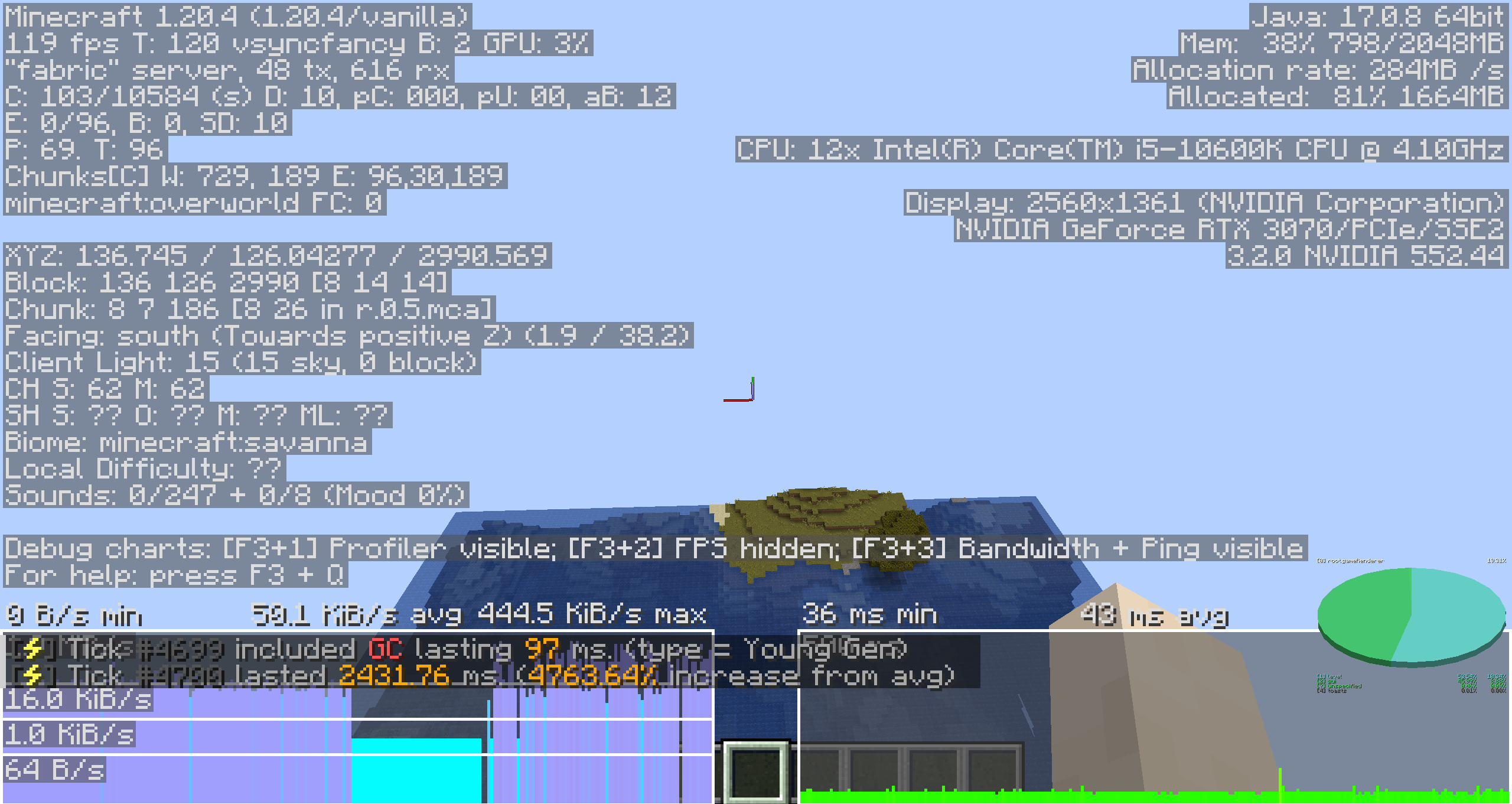 It will just stop and hang for an undetermined amount of time. Sometimes its just a few seconds, other times its 60 seconds and the server shuts down. I am trying to figure out if there could be some bottleneck with my hosting provider, such as the network, disk, etc to cause this? The server is running on 14GB of memory and 3 cpu cores, which provides very fast chunk loading outside of these spikes. I am testing it by flying around in creative mode, but these spikes happen in regular gameplay too. This happens on vanilla but I am using fabric to utilize spark, and it also occurs there. Thanks!