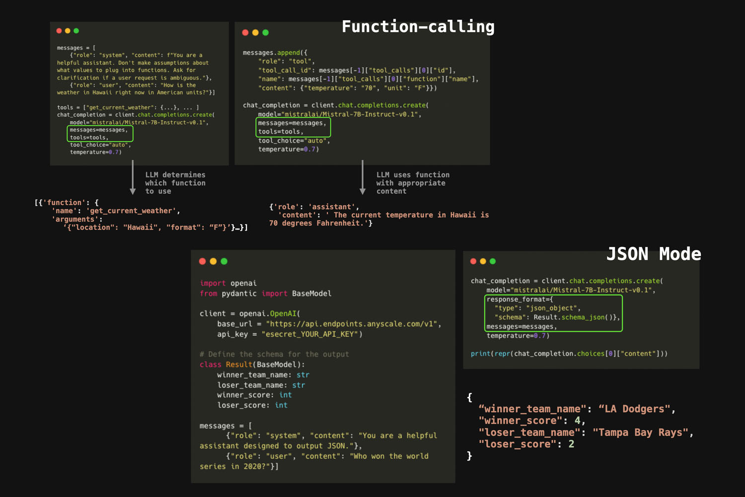 As of now I am leaning towards: Anyscale JSON Mode that returns json object of vals I ask for, thoughts? https://www.anyscale.com/blog/anyscale-endpoints-json-mode-and-function-calling-features