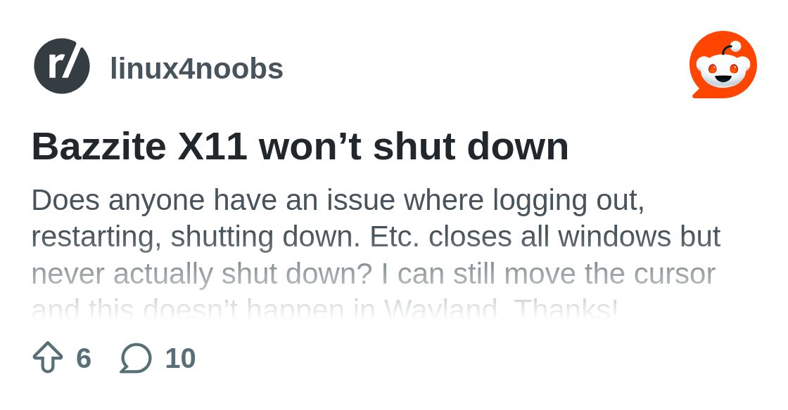 Hi, choosing shutdown or restart closes all the apps, plays sound and then goes to a black screen with only mouse cursor. Happening 100% of the times but this doesnt happen on wayland.