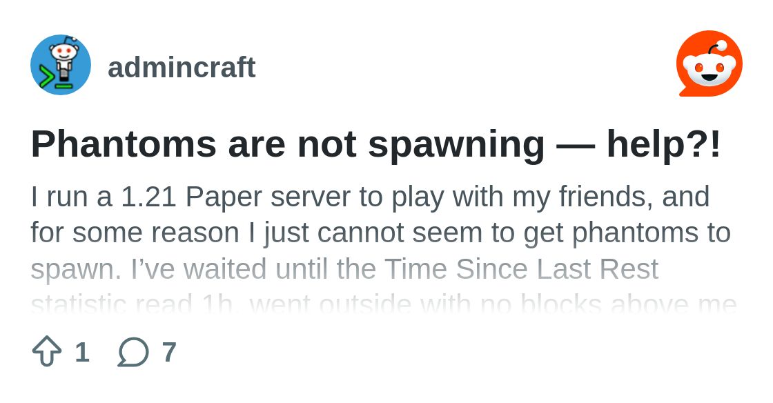 I run a 1.21 Paper server to play with my friends, and for some reason I just cannot seem to get phantoms to spawn. I’ve waited until the Time Since Last Rest statistic read 1h, went outside with no blocks above me and above y=64, but no phantoms came. I need them to spawn for phantom membranes, so please help!