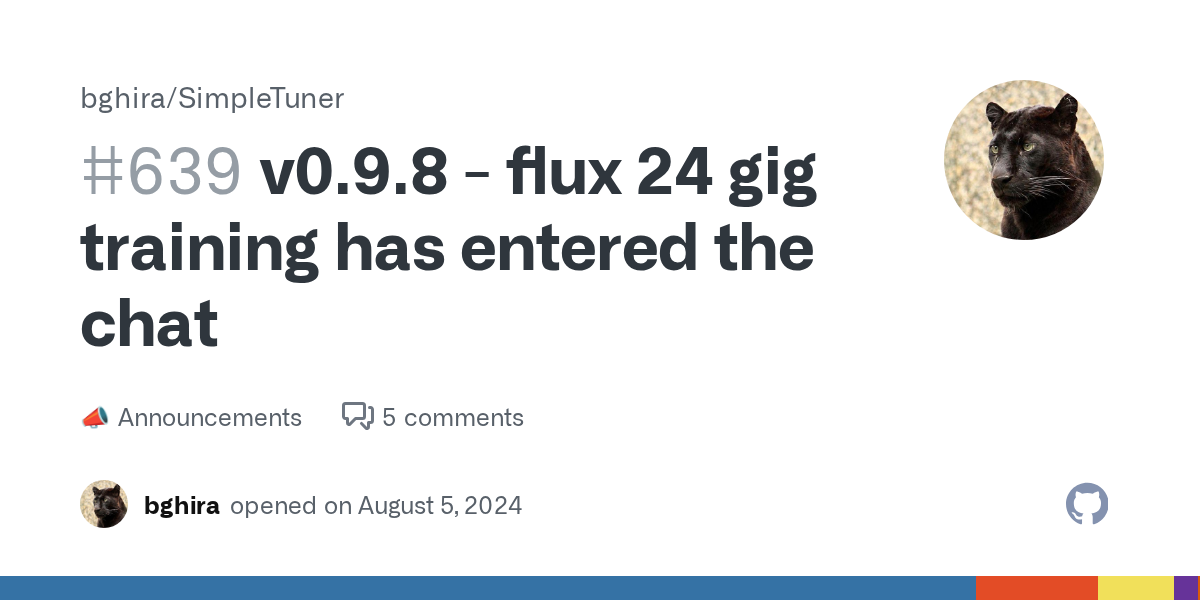 Flux It's here! Runs on 24G cards using Quanto's 8bit quantisation, or 25.7G on a Macbook system (slowly)! If you're after accuracy, a 40G card will do Just Fine, with 80G cards being s...
