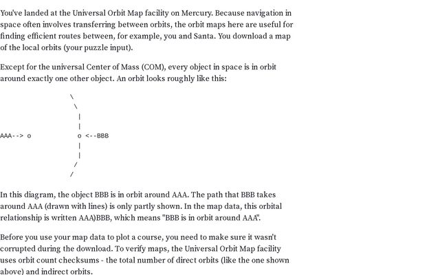 You've landed at the Universal Orbit Map facility on Mercury. Because navigation in space often involves transferring between orbits, the orbit maps here are useful for finding efficient routes between, for example, you and Santa. You download a map of the local orbits (your puzzle input). Except for the universal Center of Mass (COM), every obj...