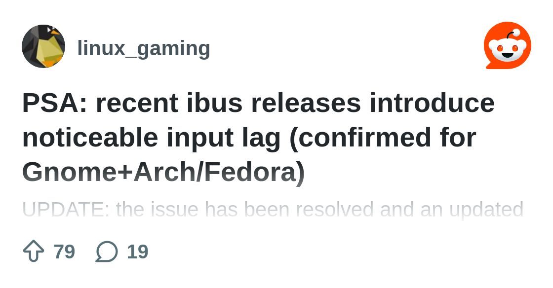 Hey everyone I'm suffering from this issue: https://github.com/ibus/ibus/issues/2618 where ibus causes input lag/delays the release of keyboard presses. Seems to only affect Gnome. My question is if we can disable Ibus with the recommended env var: