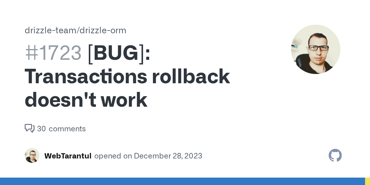 What version of drizzle-orm are you using? 0.29.2 What version of drizzle-kit are you using? 0.20.9 Describe the Bug I wrote a pretty simple transaction but when the error appears rollback doesn...