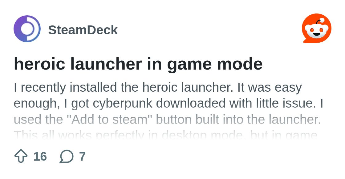 This might not be a problem with heroic at all but I'm hoping someone here knows how to fix it. I installed Sonic Mania through heroic and had it automatically added to steam. When I go into game mode and launch it, I can tell that the game launches fine because I can hear it in the background, but steam never leaves the "launching game" screen. Its not finding the game as a separate window either, it just doesn't seem to recognize that the game launched. In desktop mode, the game launches without issue. Does anyone know what might be causing this? I'll update in a moment with heroic logs and system info in case that helps