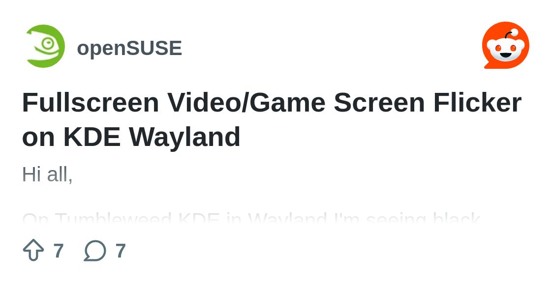 I'm running OpenSuse Tumbleweed, fully updated (zypper, yast, discover, flatpak) running AMD, and since a few days ago, games that worked correctly, now have minor flicker during startup, but render nothing once the game is loaded. As in, black screen, no video. I can alt-tab out, and I can see the correct image when the game is non-focussed. I can hear audio, i can move, but nothing is rendered if the game is in focus.