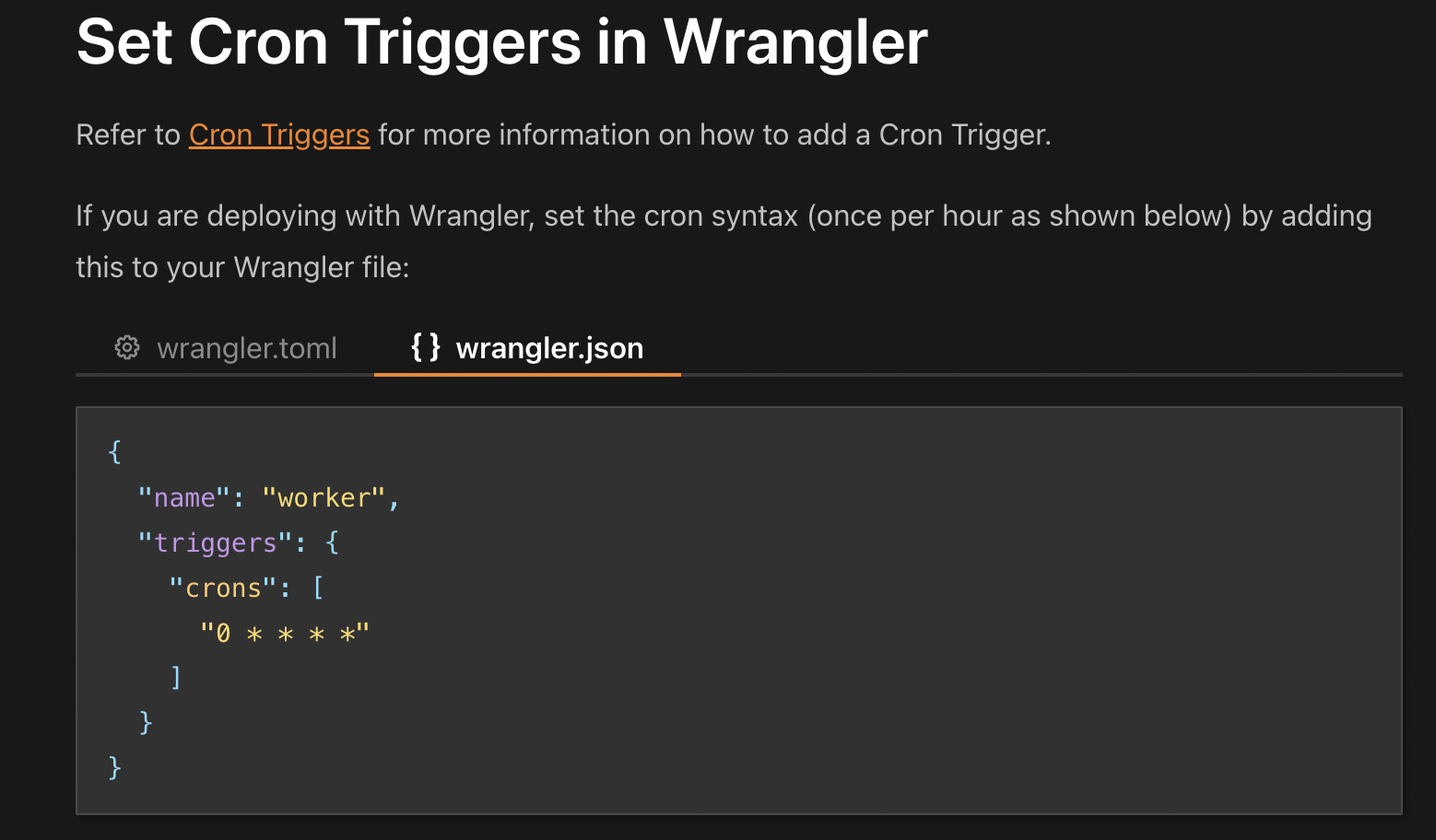 wrangler.json file:How can I add cron job to that file? How can I extand that file to cron job?