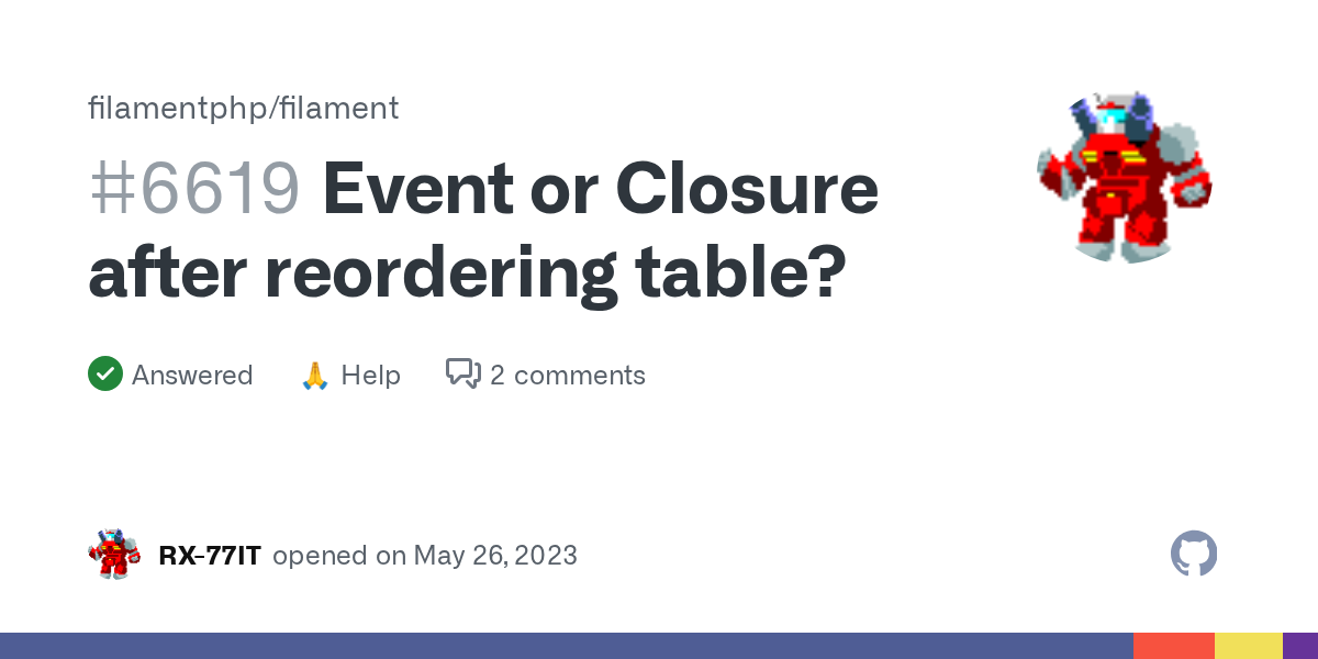 Perchance, is it possible to set up an event after reordering a table with ->reorderable()? Or maybe pass a Closure that in some way is executed after reordering?