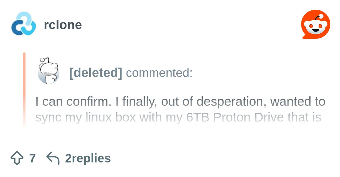 You need to read the actual response from the official proton team, not what some random dude on Reddit claims. And no, "not officially compatible" is definitely NOT the same as them "blocking rclone". It does indeed work, I used it the other day. And they literally say that you can use it, which you would know if you had read all the information provided by YOUR link. Just because things don't work the way you want them to doesn't mean you should spread false information. I don't even understand what their focus on privacy has to do with the availability of a sync client. You can always use a browser even if rclone would not work.