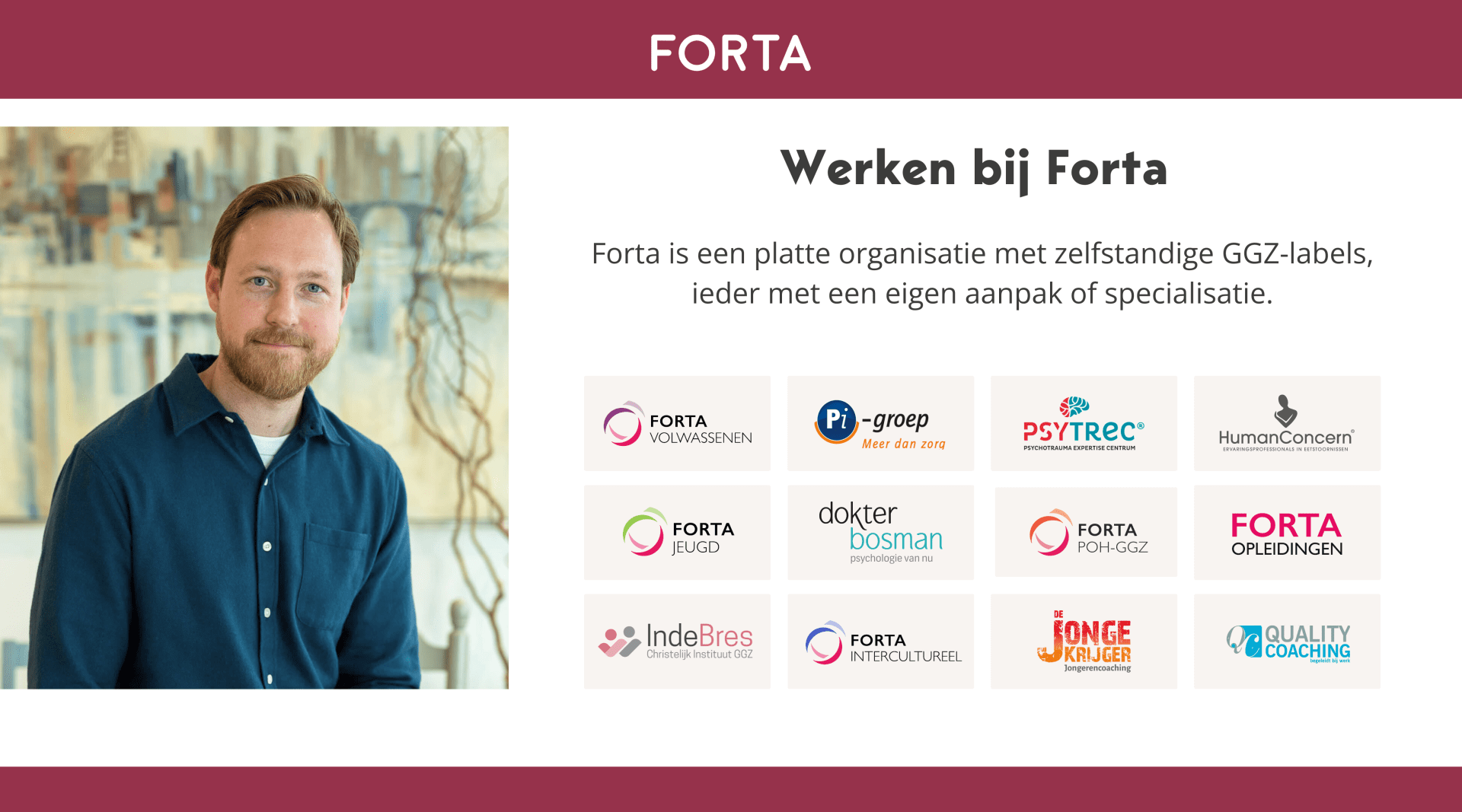 We zijn een netwerk van zelfstandige GGZ-labels, elk met hun eigen aanpak en specialisatie. Bekijk de vacatures van Forta volwassenen, PSYTREC, Human Concern, Pi-groep, In de Bres en Dokter Bosman.