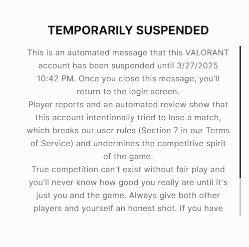 I already sent in a ticket regarding the situation. But anyways, I keep getting temporarily banned for ''intentionally trying to lose a match" which I haven't even done. Today, at 10pm or so, I was just trying to play valorant. I warmed up in tdm and played one game of swift. No issues or whatsoever and won as usual then I queue up for another game but I didn't like the map so I dodged it then I get the warning. Been like that for two days straight now.