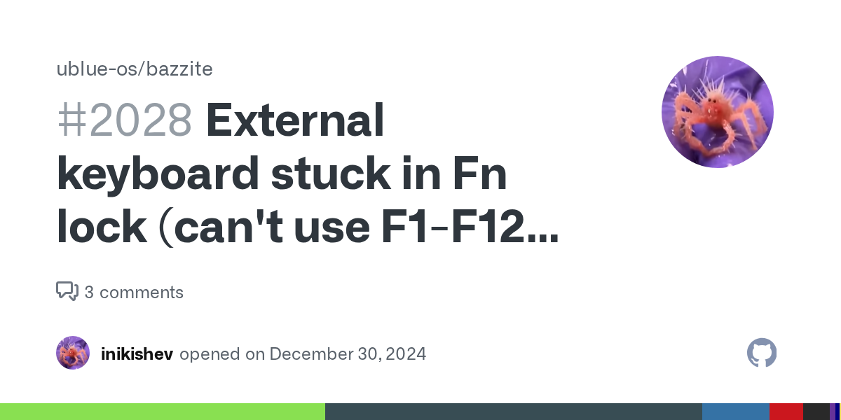 Describe the bug My external keyboard is stuck in Fn Lock, meaning F1-F12 keys can't be used for anything other than changing brightness. For example, when I try to rename a file with F2, it in...
