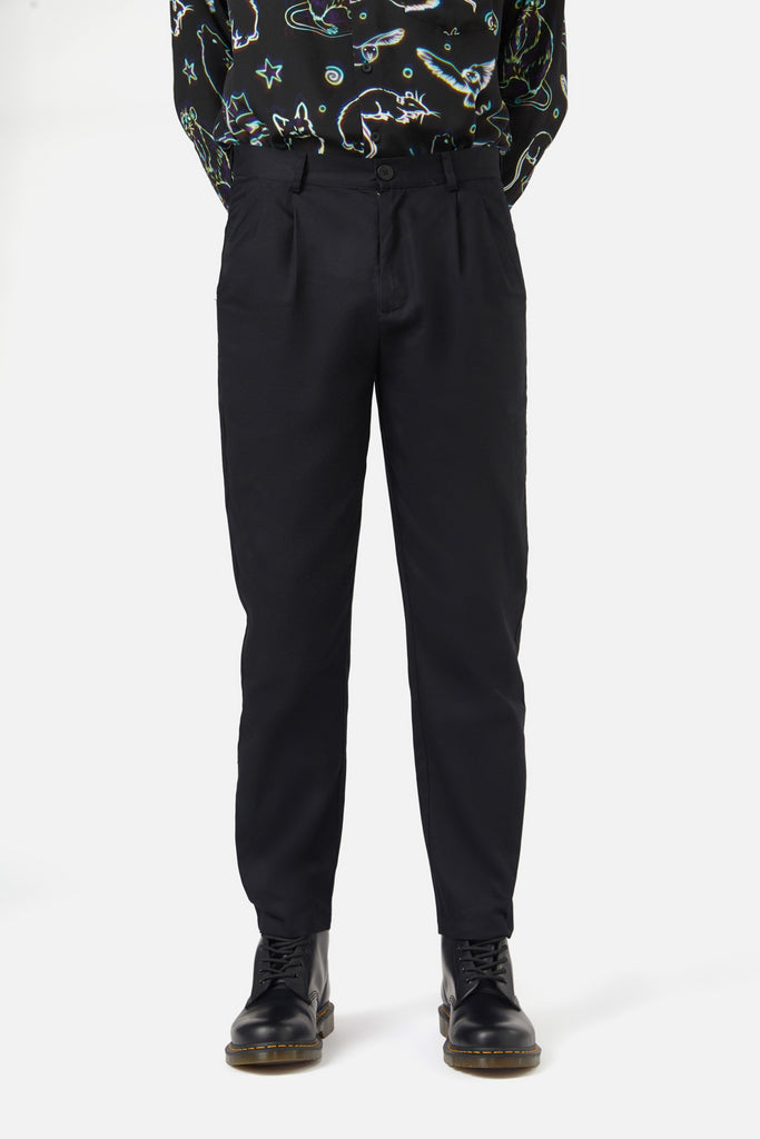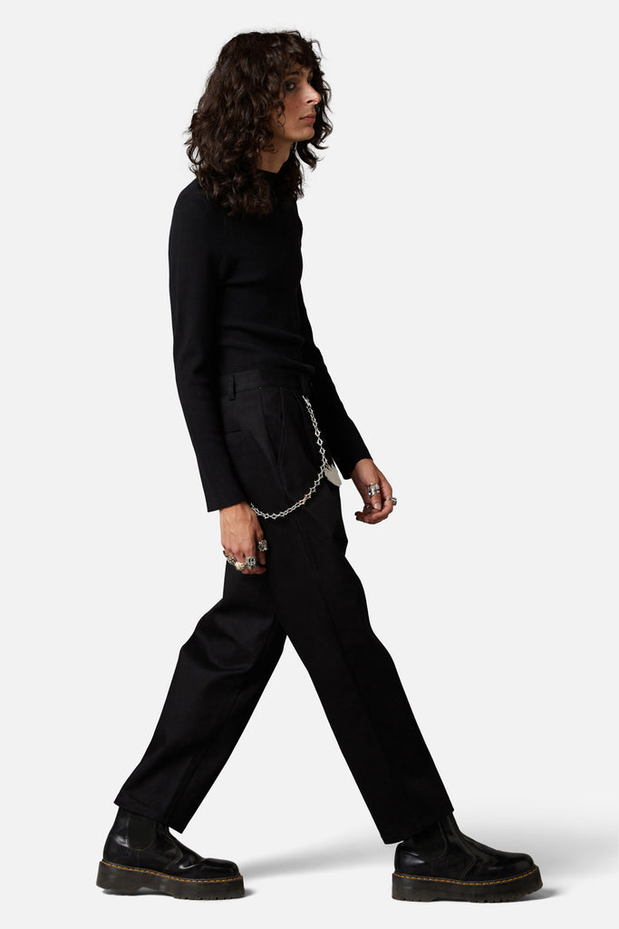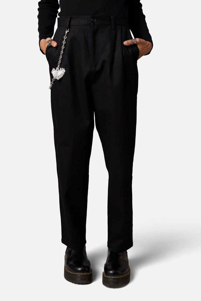 Tapered Black Pant-Long legged-Chain Attachment to Pant-Front & Back Pockets-Black Top Stitch Detailing-Made from Cotton-Available in Black Product Code: DBFV052
