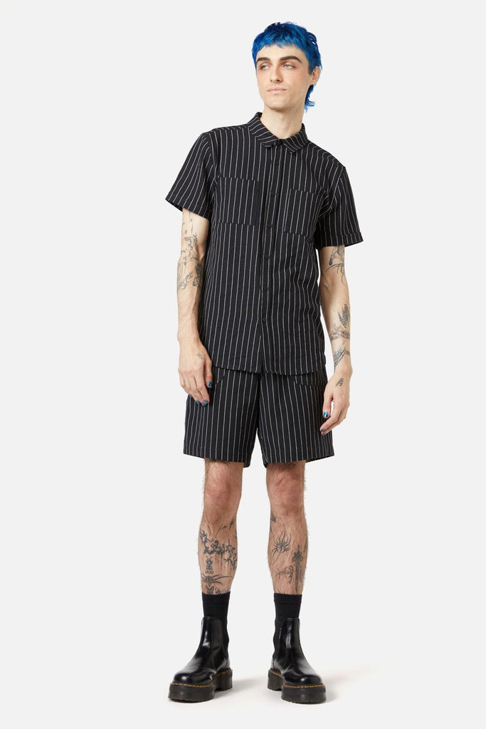 Pinstripe Shirt- Features Pinstripe Detail- Has Button Front- Short Sleeves- Pocket Details On Front- Shaped Collar- Made From Cotton- Available In Black Product Code: BBFY090