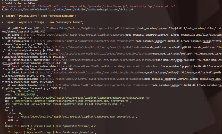"PrismaClient" is not exported by "generated/prisma/index.js", imported by "app/.server/db.ts"