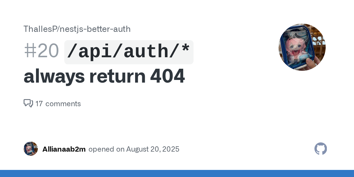 I am encountering an issue where all requests to endpoints under the /api/auth/* path result in a 404 Not Found error.This occurs even with a minimal project setup using better-auth and nestjs-bett...