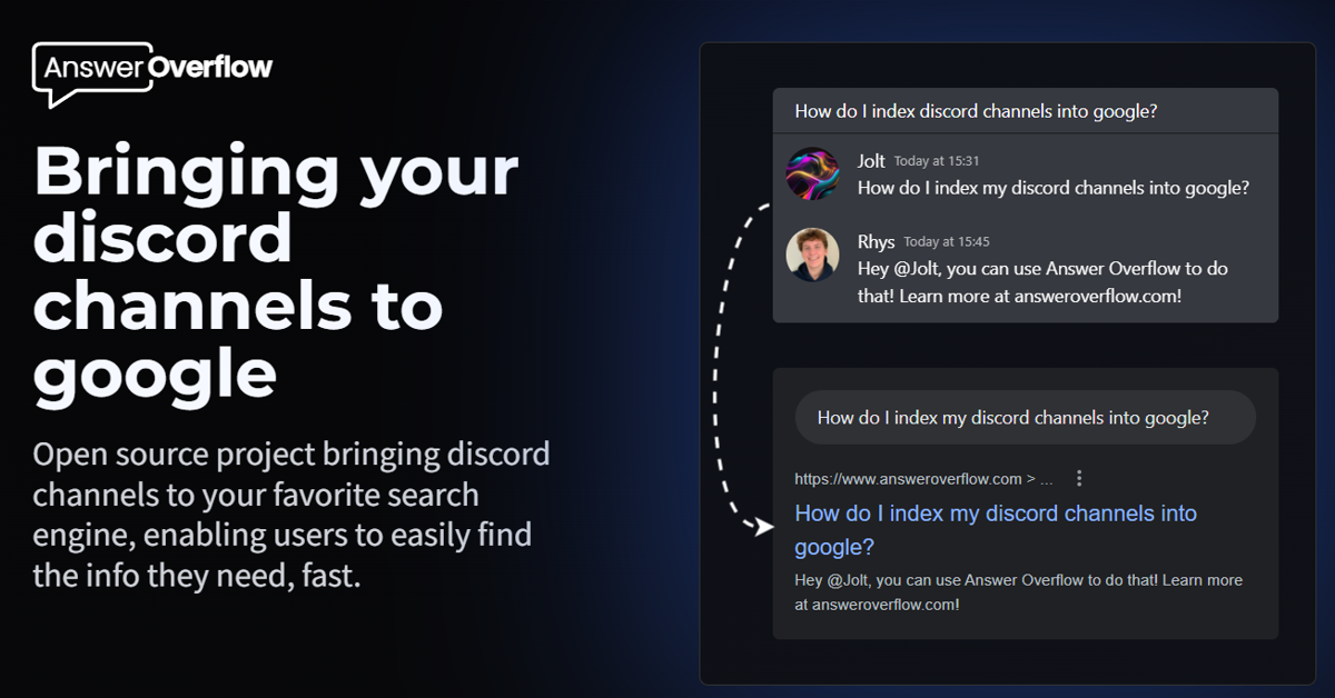 Build the best Discord support server with Answer Overflow. Index your content into Google, answer questions with AI, and gain insights into your community.