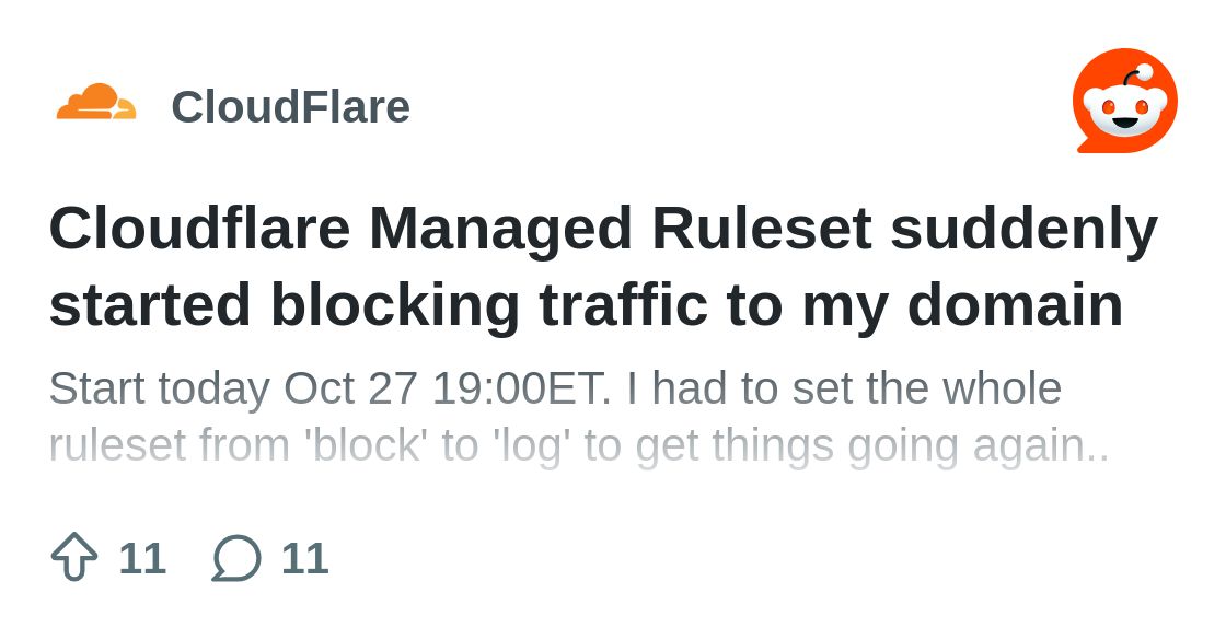 https://www.reddit.com/r/CloudFlare/comments/1ohvmzl/cloudflare_managed_ruleset_suddenly_started/